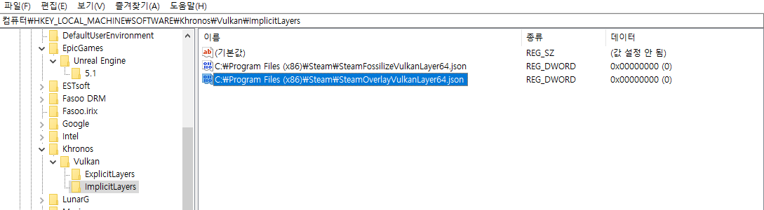 HKEY_LOCAL_MACHINE\SOFTWARE\Khronos\Vulkan\ImplicitLayers 그리고 ExplicitLayers