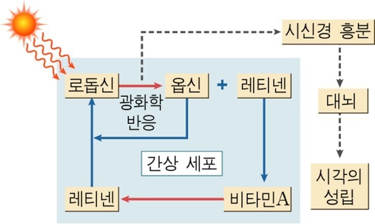 우리가 어두운 곳에 있다가 밝은 곳으로 나오게 되면 로돕신이 빛에 의해 광분해 된다. 한번에 많은 양의 로돕신이 분해되어 눈 앞이 아무것도 보이지 않는것도 이 때문이다.